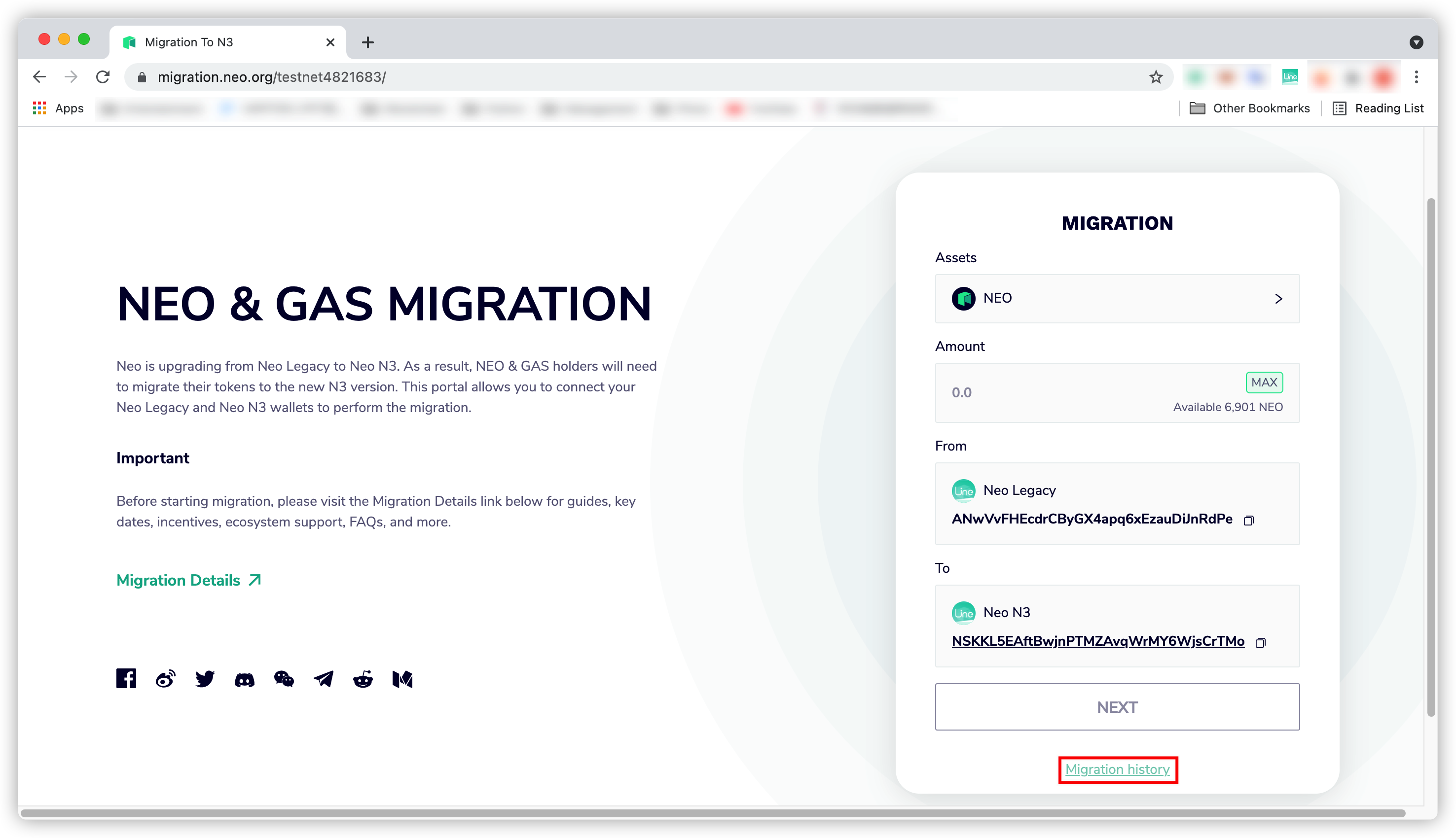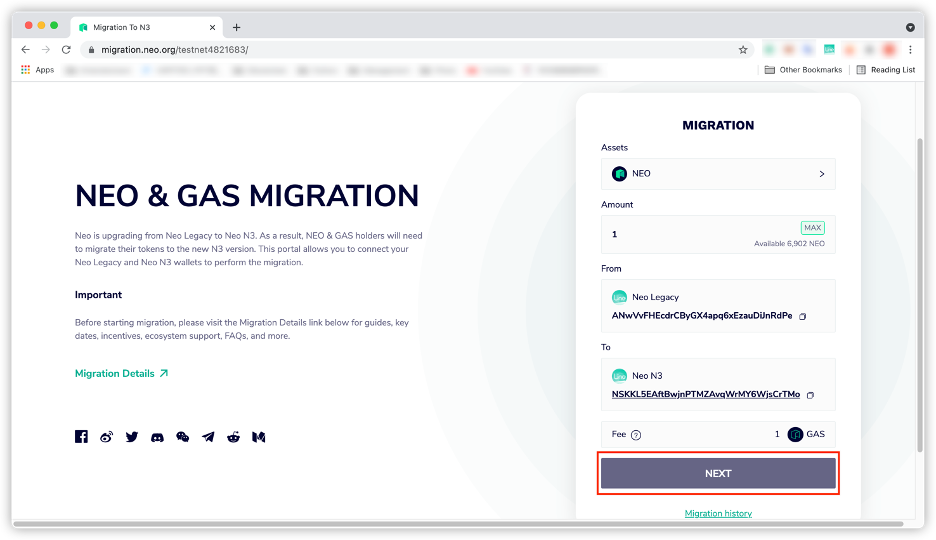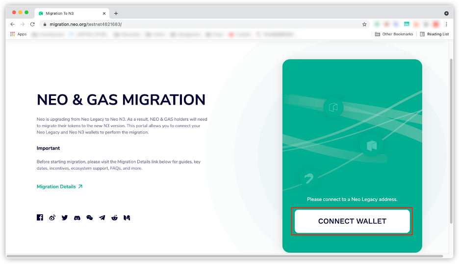 3. Go to the [Migration To N3](https://migration.neo.org/) website. Click `CONNECT WALLET` .<br>