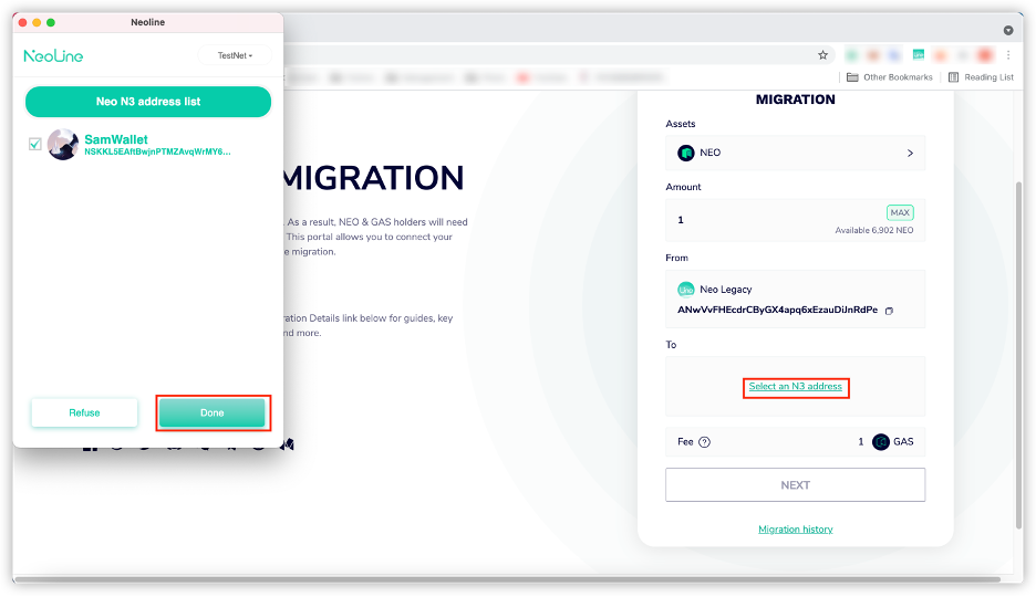 8. Click `Select an N3 address` to select an N3 wallet address that you want to migrate to and then click `Done` .<br>